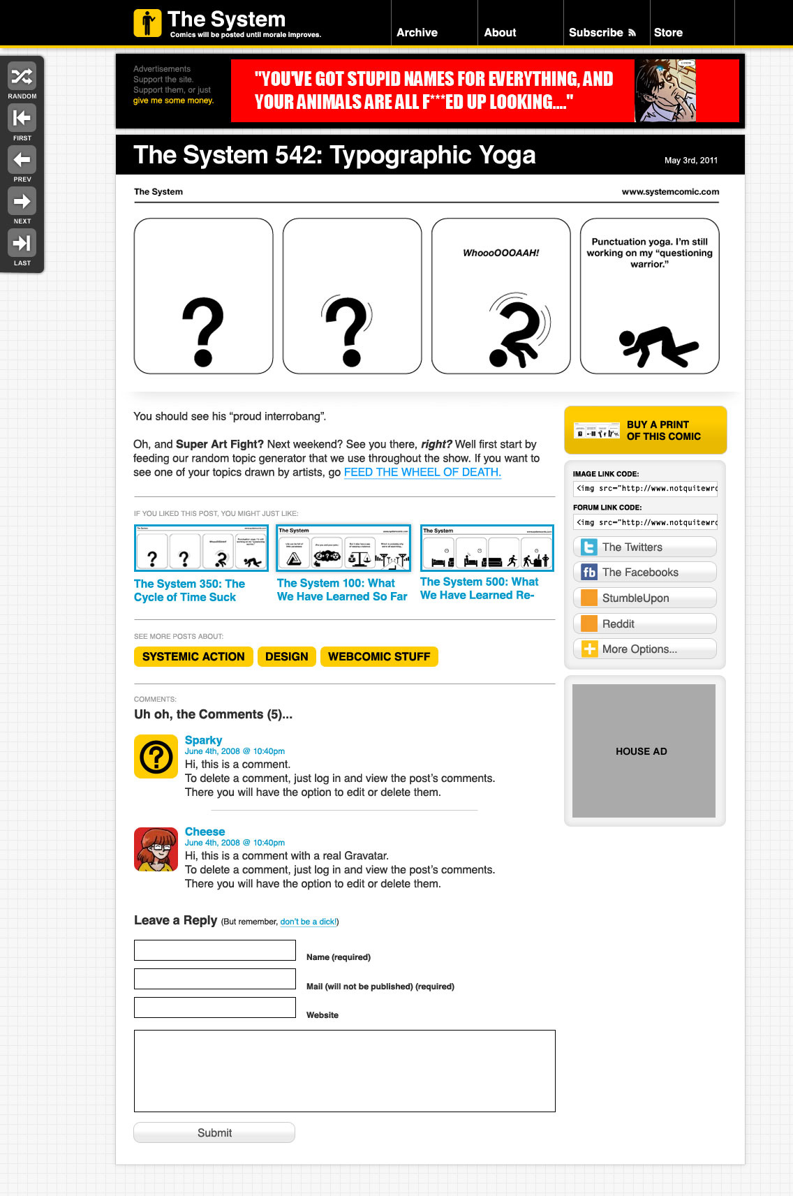 There is a large number of webcomics out there, most of which use the same template structure for navigation of their archives of comics. While there is a case to be made for standardization, this template was first developed in the late 1990's, when ideas of web design and site structure were very different and much more basic than they are today. In a post that I wrote on my site, I proposed integrating new technologies and ideas from other websites into a new idea for the comic template. Utilizing persistent elements and related posts, taking cues from addictive sites such as Tumblr, YouTube, and Gmail, I developed a new approach to the webcomic site, which I'm hoping will revitalize the "web" part of the webcomic community.